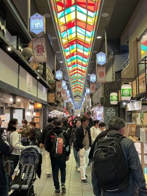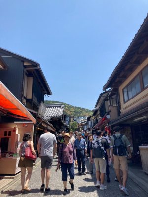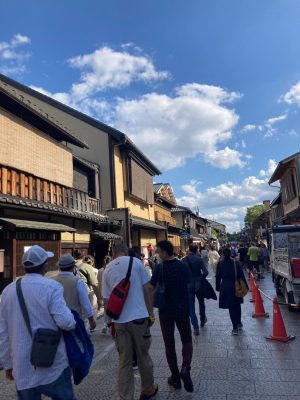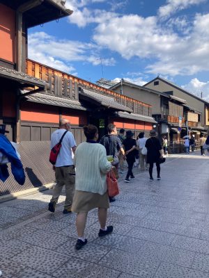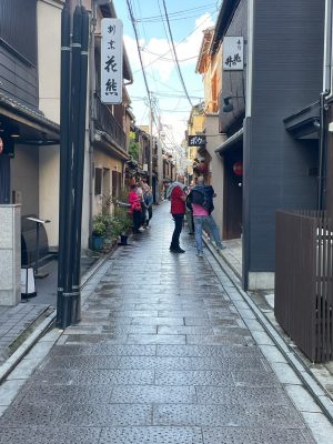 花街では時間帯によっては舞妓さんに会えるかも、という事で男性陣は楽しみに。
