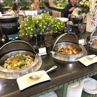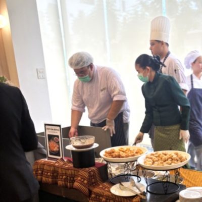 女性陣のテーブルの後ろで実演調理されていたトウモロコシ、ごぼうの天ぷらはすかさず揚げたてをゲット!
